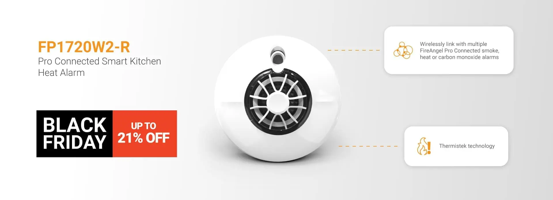 Save in our Black Friday deal on the Pro Connected Smart Kitchen Heat Alarm, FP1720W2-R, battery powered with wireless interlink. Thermistek technology provides a quick alert to rapid rises in temperatures, making heat alarms suitable for kitchens, garages and lofts as they don’t react to cooking fumes or dust.