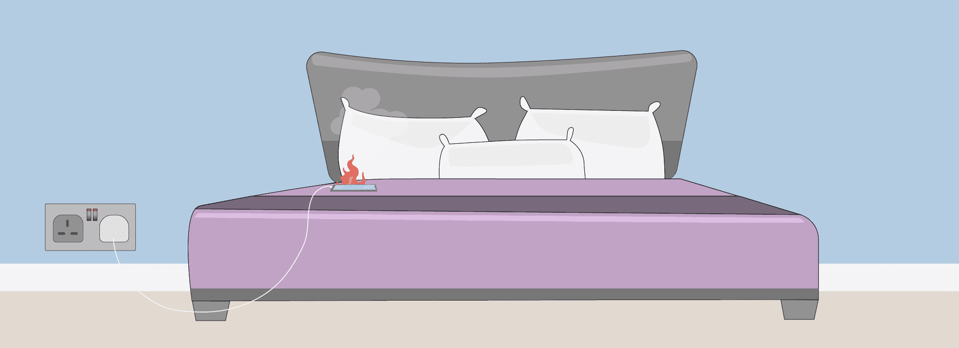 Never charge phones, laptops, or other devices on soft surfaces like beds or sofas. Always charge them on a hard, flat, non-flammable surface to reduce fire risk.