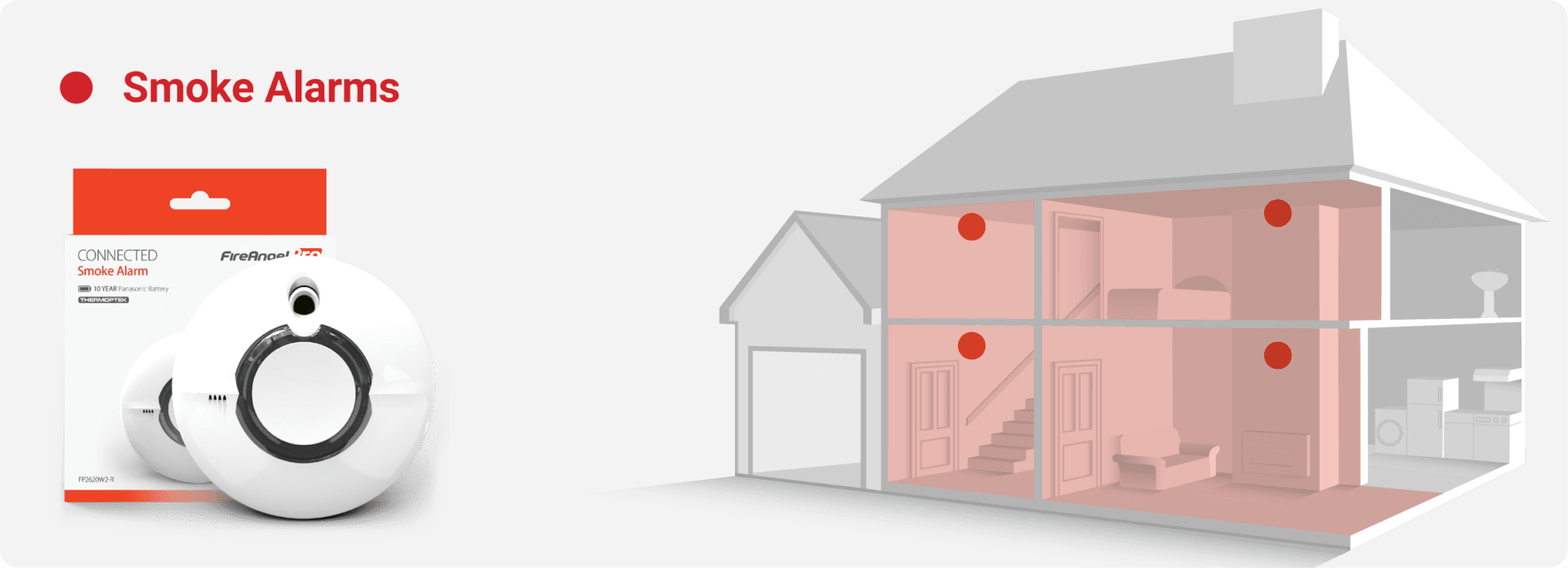 For the fastest detection of fire we recommend you install a smoke alarm in the circulation space on each level of the home (hallway and landing) as well as in living spaces and bedrooms. We would install these alongside heat alarms in the kitchen, garage and attic and have the alarms interlinked so that if one alarm sounds, they all sound.