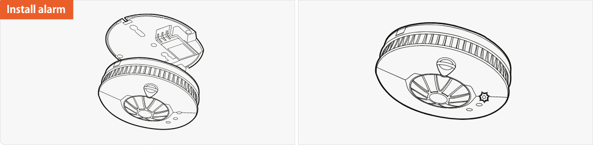 After fitting the alarm to the base plate, wait for 5 seconds for the alarm to settle, then test the alarm. See alarm testing