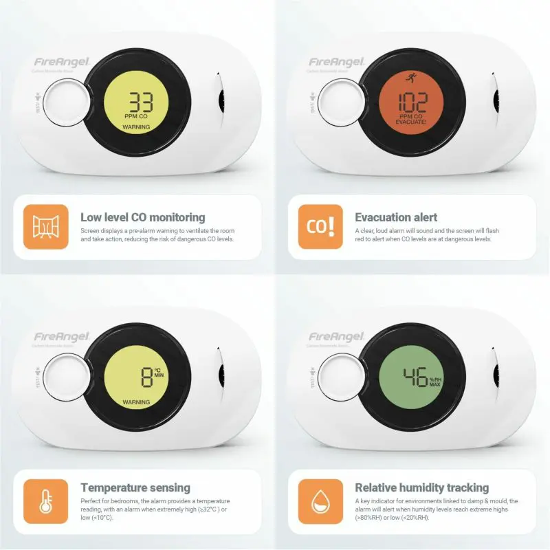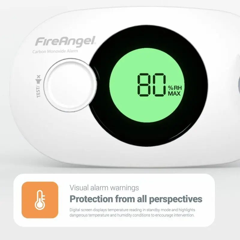 - The digital display screen provides visual alerts to CO, temperature and humidity levels with written instructions and guidance to protect you and your family