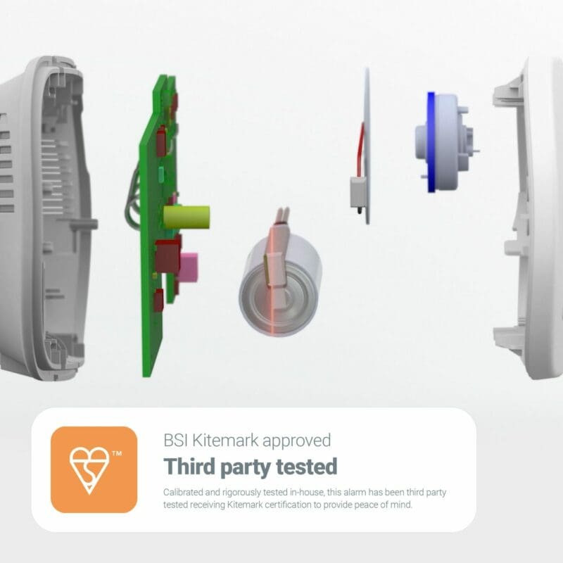 Designed to protect residents in social housing and private rented properties from carbon monoxide (CO) dangers, featuring additional built-in temperature and humidity sensors that logs environmental readings. Landlords can extract device data using our free app to help identify properties at risk of damp and mould. Intelligent CO sensing technology, a loud clear alarm and a BSI Kitemark approval ensure the highest level of CO detection.