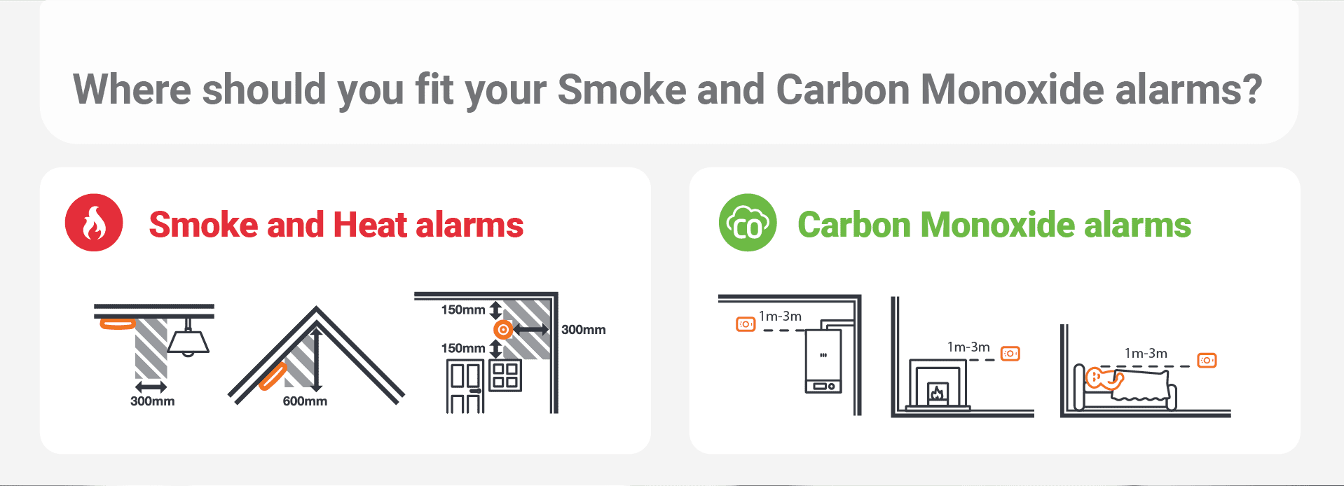 For domestic properties, fire alarms (typically comprising a network of smoke, heat, and CO alarms) should cover: