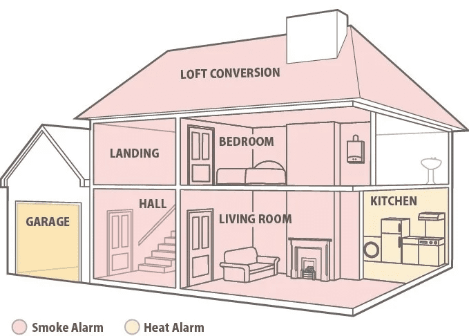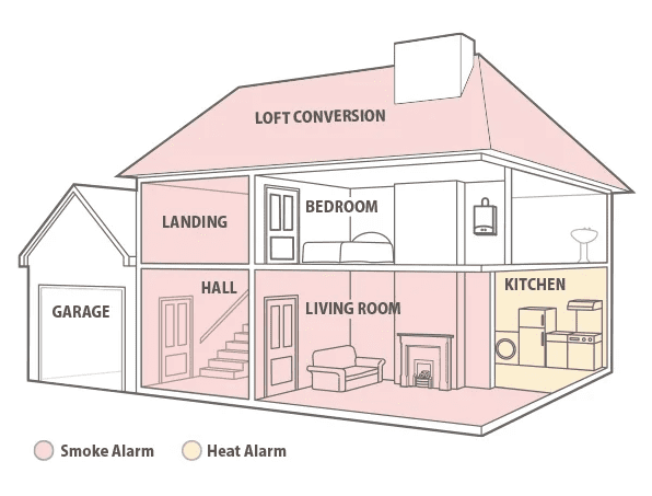 | Escape routes, high risk rooms plus all areas where a fire might start | Escape routes, high risk rooms plus all areas where a fire might start