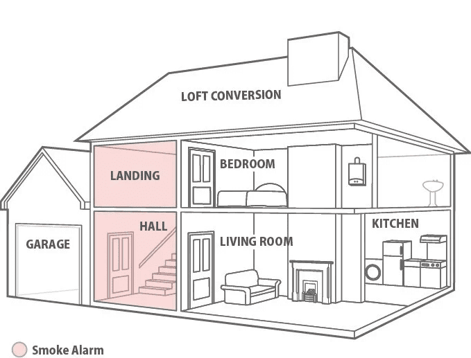 Category LD3: A system incorporating detectors in all circulation areas that form part of the escape routes from the premises. • Hallway Note: This minimum category now only applies to owner occupied bungalow, flat, single-storey unit or maisonette with no floor level above 4.5m from ground level or owner-occupied two-storey house. |
